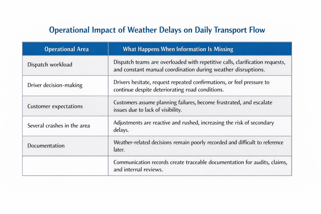 Usually a weather delay is not just a delay. It also disturbs dispatch allocation, driver hours, and customer inventory, and in some cases, it affects the aspect of contractual obligations. When the communication fails, the doubt takes over and occupies the territory. The customers’ call to the dispatch is most of the time frantic. Dispatchers are then facing the pressure as there are angry conversations of drivers demanding dispatches. Everything becomes hard.